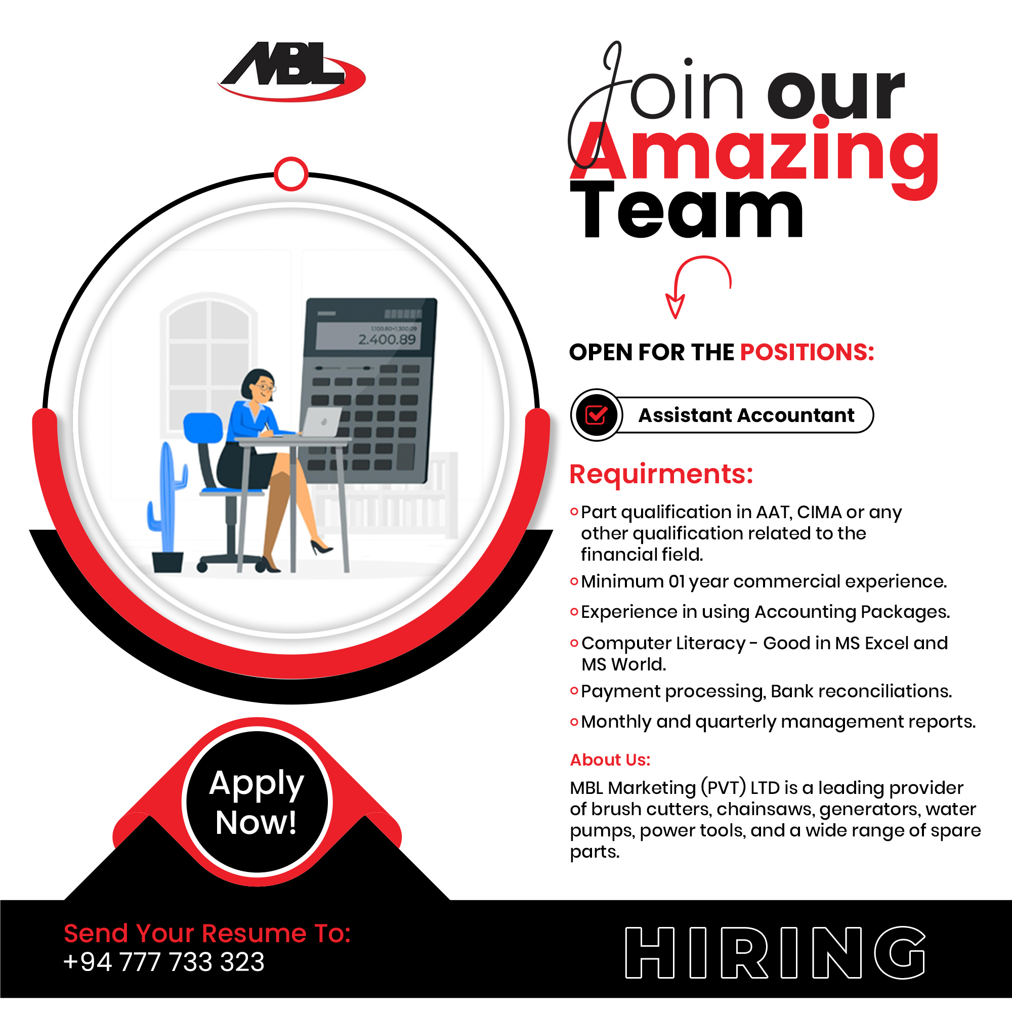 Join our team at MBL Marketing! We are looking for a Assistant Accountant to be part of our growing company. If you have Skills or Qualifications, weโd love to hear from you!