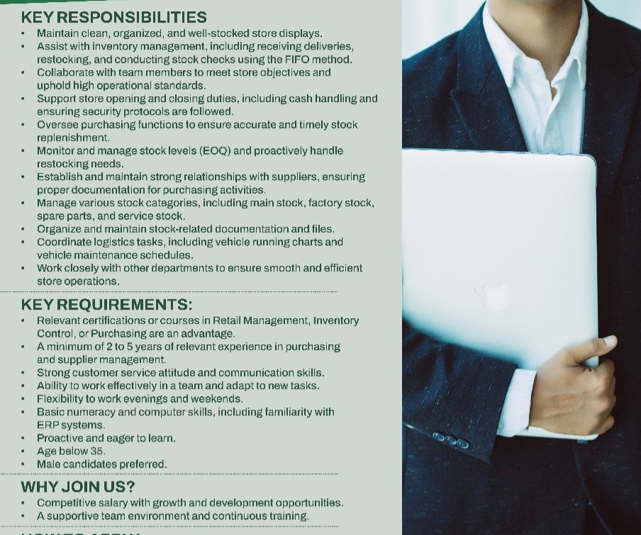 - Relevant certification or courses in Retail Management, Inventory Control, or Purchasing are an advantage